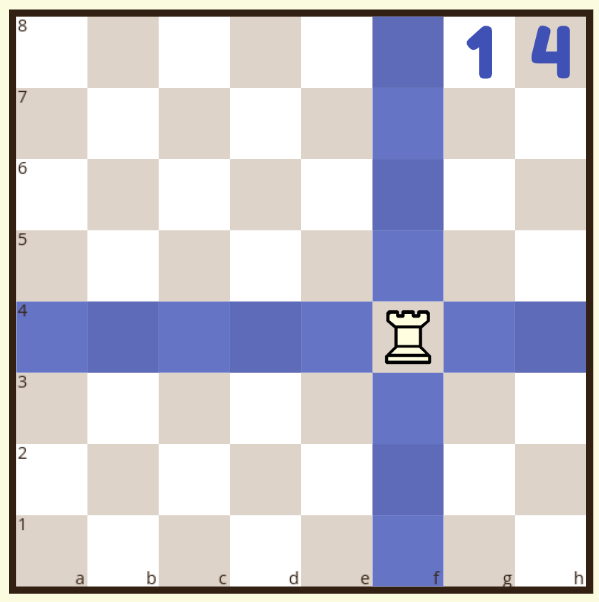 Board 2: The rook is on f4. Which squares does the rook attack now? How many squares in total?