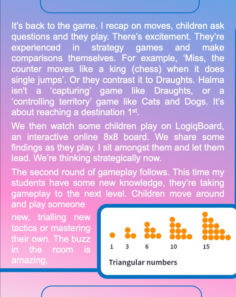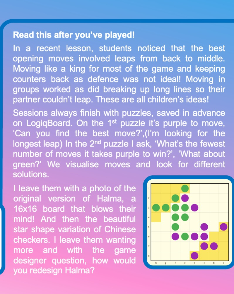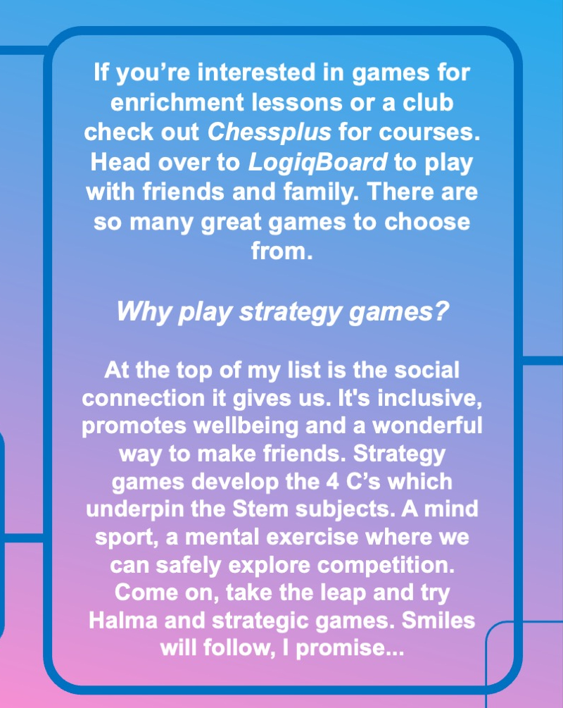 Hi everyone, as promised here is my bonus blog on some games for the festive period. I wrote Mind Games for Fusion magazine in the Summer. If you’ve tried the game ‘Fox and Hounds’ then ‘Halma’ is a great game to try out next with your students.