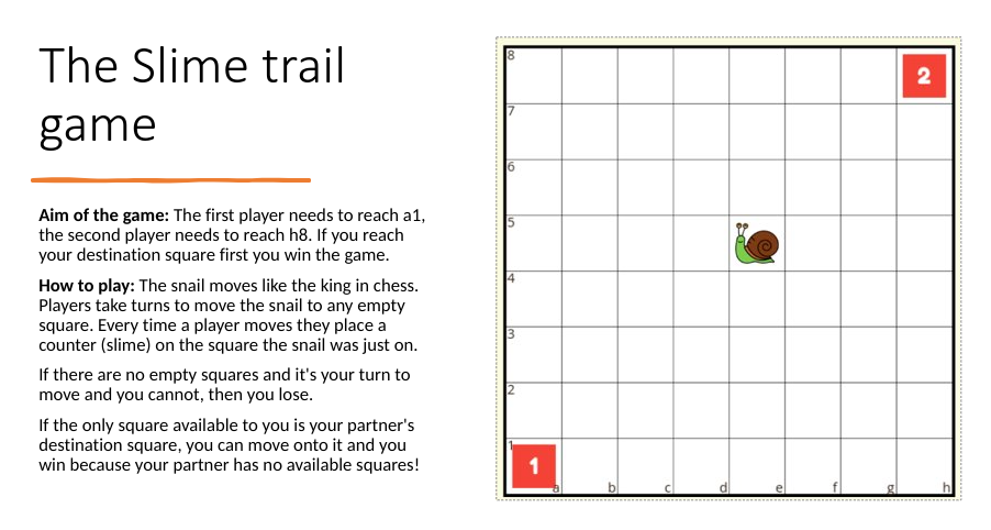 Like Fox and hounds, Slime Trail is one of our easier strategy games. Slime Trail was invented in 1992 by Bill Taylor. The snail moves like a King in chess. The first player has to reach a1 and the second player has to reach h8. The first to reach their destination wins. Every time you move the snail you leave a counter (slime) behind. The aim is to reach your destination first. You can also stop your partner by blocking them, closing off a wall so there’s no way they can reach their target square. You lose if it’s your turn and you cannot move anywhere! If your only move is to land on your partner’s destination square and there are no other squares left you win! (They cannot move after that so you’ve won the game!)