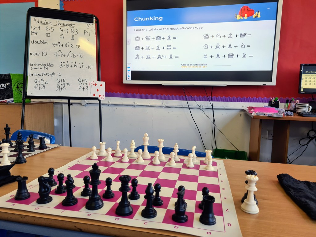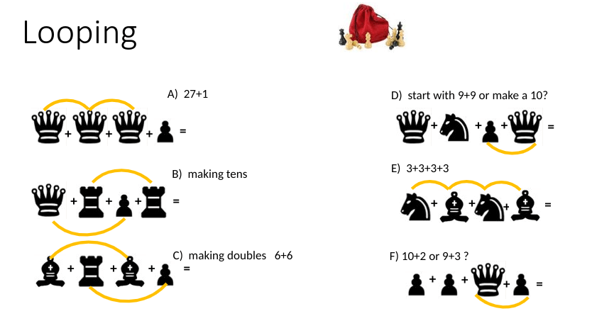 I hope you can see that last week’s learning goes beyond the board. These skills will be needed in timed games, tournaments or in games where no player has created checkmate. Mini lessons and lunch clubs included. They’re also key strategies for maths. Look at the addition sum below, which strategies would be useful for each column?