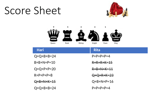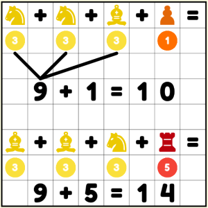 Most of my younger students know the point values but when they’re adding up points I sometimes see children ‘panic adding’. There’s often no system or order to their counting. Add all the pawns first. Add whatever is nearer to them. Maybe the queen first. If there are many pieces captured children might estimate a total, miscount or give up.