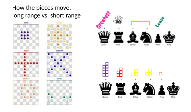 This lesson is a great moment to discuss the point values if you haven’t already. Big questions to ask might include: Why shouldn’t we give the king a point value of zero? What do the point values tell us? Are they linked to the way a piece moves, captures or something else? Look at the values, what can you tell me about the numbers? Seven is the missing odd number, design a piece that could be worth seven points. (Oops, this is how my mind goes off on a tangent!)