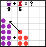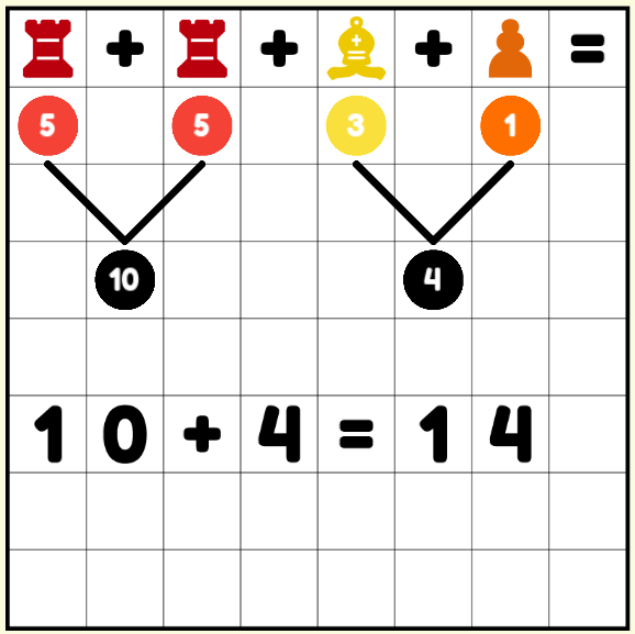 The final strategy is bridging through 10. It’s all about that ‘friendly’ number 10 again. Here I show children how much easier it is to work with 10. If we have Queen + Rook, for example, the number sentence is 9+5. Many children will put 9 in their heads and count on five more, ‘9…10, 11, 12, 13, 14’.