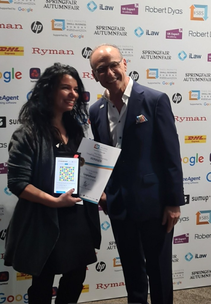 I have a wonderful event to share with you. LogiqBoard won their first award! We’re now an official SBS winner. This means we’re part of the small business network led by Mr Theo Paphitis. Theo is a well known business magnate, entrepeneur and former Dragon from the famous Dragons Den TV programme. It’s an honour that our little LogiqBoard business was one of his favourites just before Christmas.