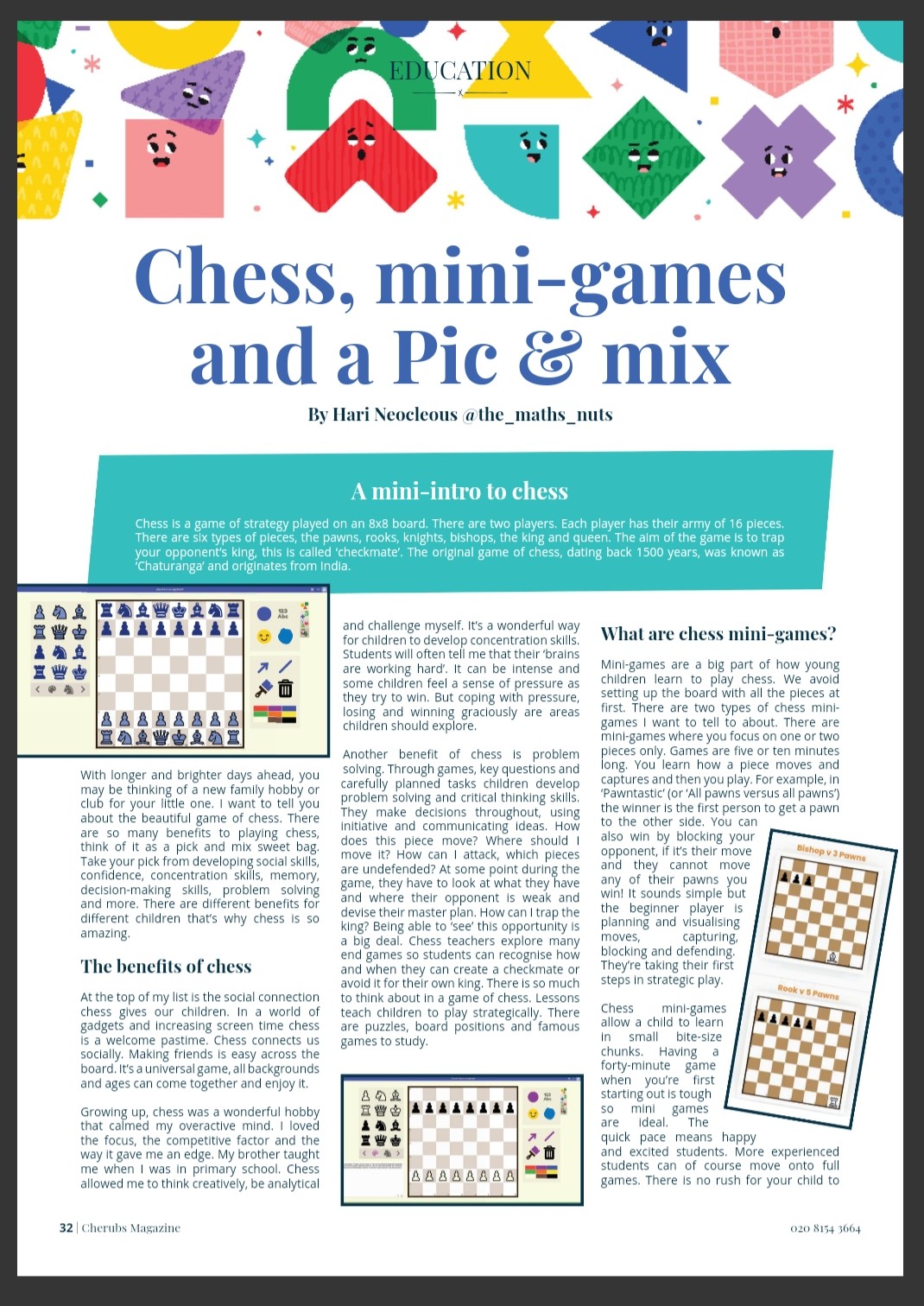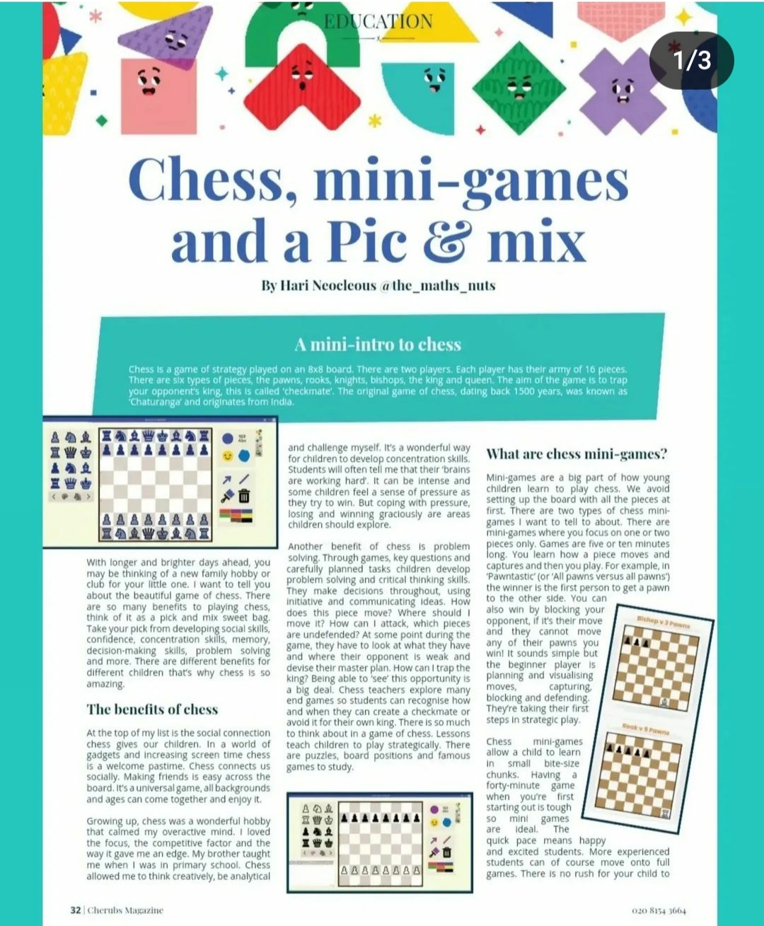 Last month I shared some of my chess articles from R.I.S.E. education magazine. Today I’m sharing another magazine. It’s the gorgeous Cherubs family magazine, a quarterly UK based magazine also available online.