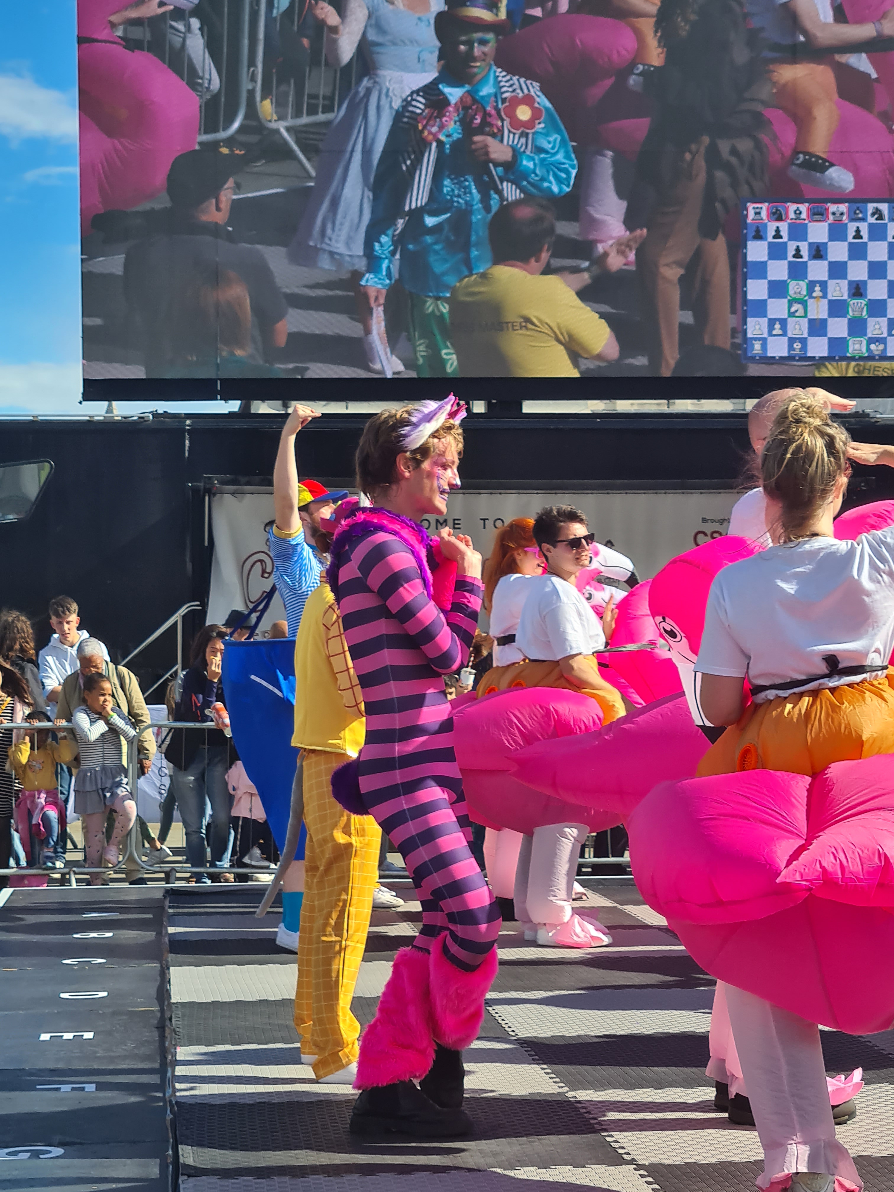 I’ve been to previous Chess Fests and the actors are brilliant. But this performance was the funniest. Pink pawn flamingoes versus eight brown hedgehogs! I laughed watching the dramatic bishop capture, landing on his bottom, legs in the air and side rolling off stage. He was some sort of stunt man surely.