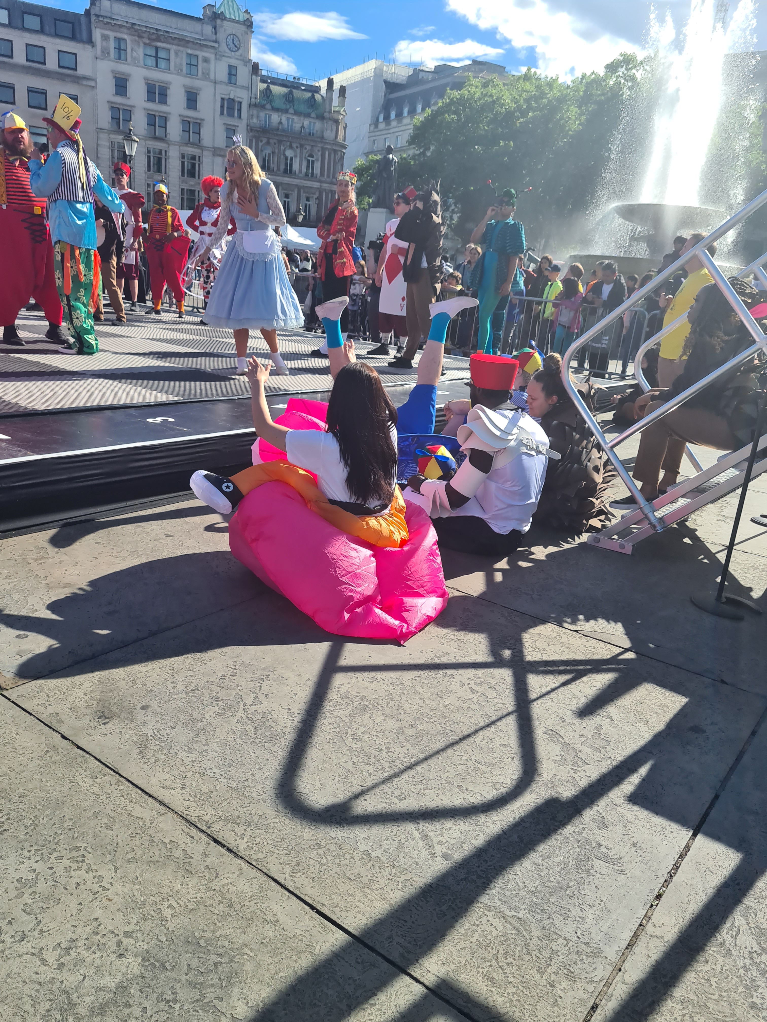 Also how else would I capture little gems like this? Can you spot the real little queen as her parent holds her blue train and she glides through Trafalgar Square? A British queen right there.