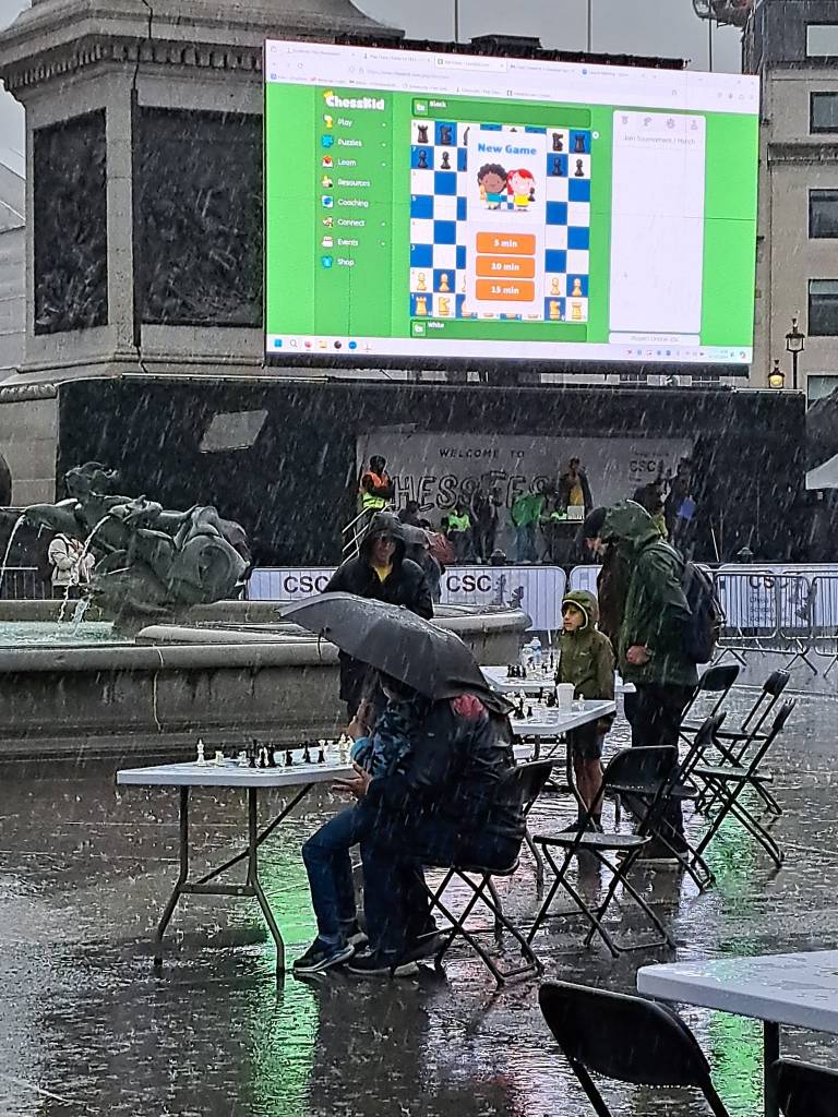 The photo below was taken by my friends from ChessPlus. A photo of pure dedication. The little boy is playing against a grandmaster as his sweet Dad shields him from the pouring rain.