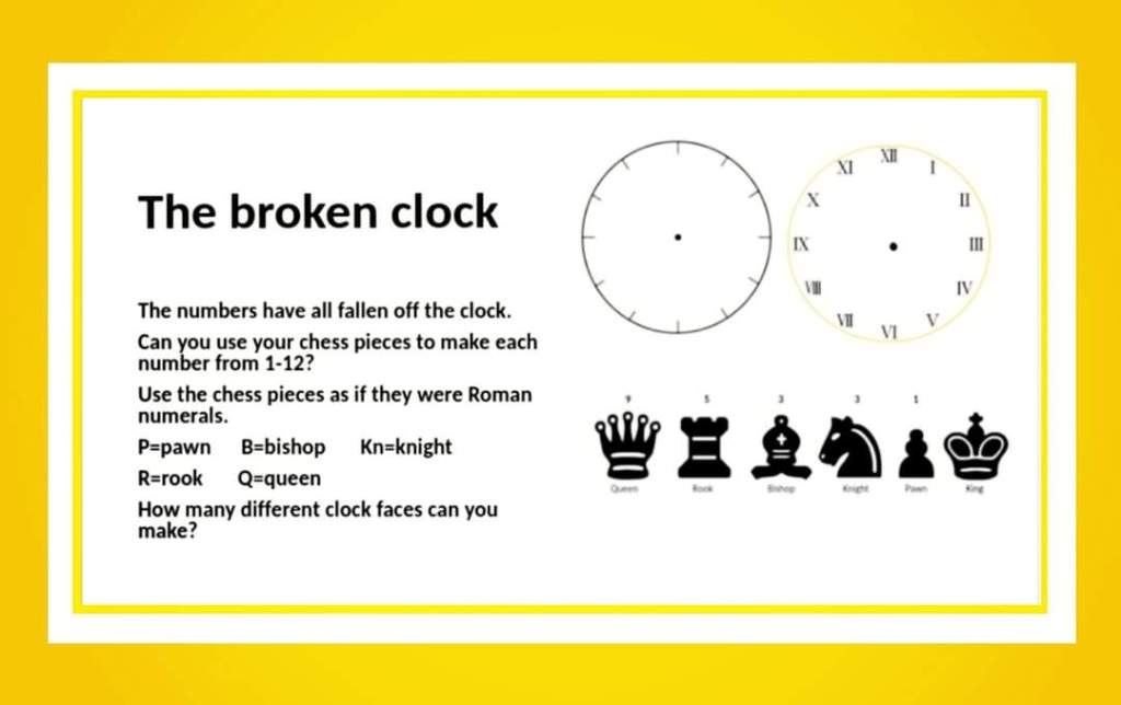 You could give them cut out strips with sets of chess pieces making totals one to twelve. Give the strips of paper all muddled and children have to order them in ascending order with a partner. You could also share a ‘Spot the Mistake’ Clock. Which chess pieces do not make the correct value?