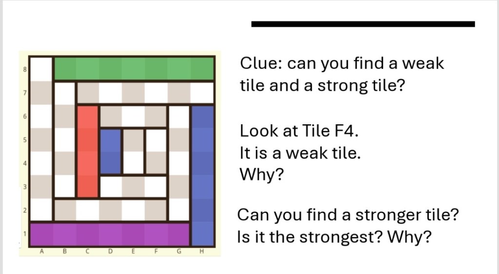 Hands will go up as many will have their ‘eureka’ moment I ask them to tell their partners what is a weak tile and what is a strong tile once more.