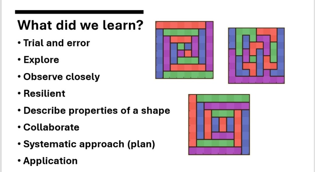 It was fascinating to hear from one year five girl, ‘Miss, at first puzzle 1 was the hardest because I had no strategy then. Puzzle 2 was easy and puzzle 3 was also hard because I couldn’t find a strong tile to start off with…’