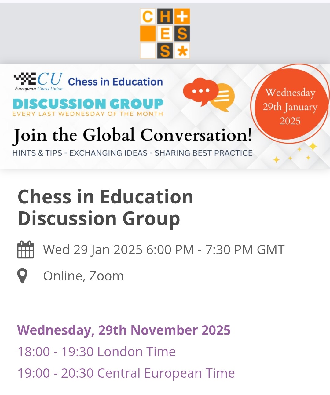 Join host, Brigitta Peszleg and myself, as I’ll be presenting a session on Talk tasks in the chess classroom and chess club. You’ll leave with a whole range of talk tasks to take back to your students. We’ll be talking communication skills, silent chess, critical thinking and more! To join the discussion click: https://www.tickettailor.com/events/chessplus/1541858