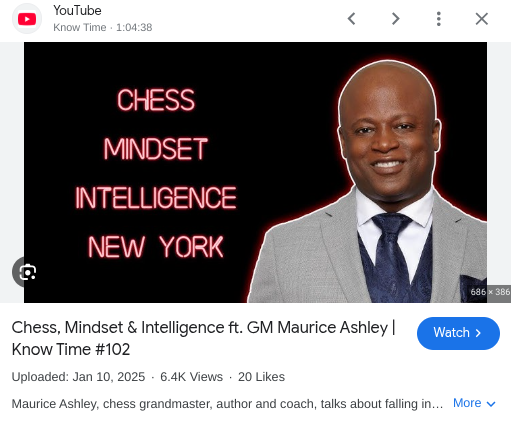 Next up is a brilliant podcast with Maurice Ashley, the author of my favourite children’s book, The Life Changing Magic of Chess. I dare you to watch five minutes of the Know time podcast and not be hooked. Maurice talks chess, AI, world champions, hustling, chess psychology, life and the art of chess.