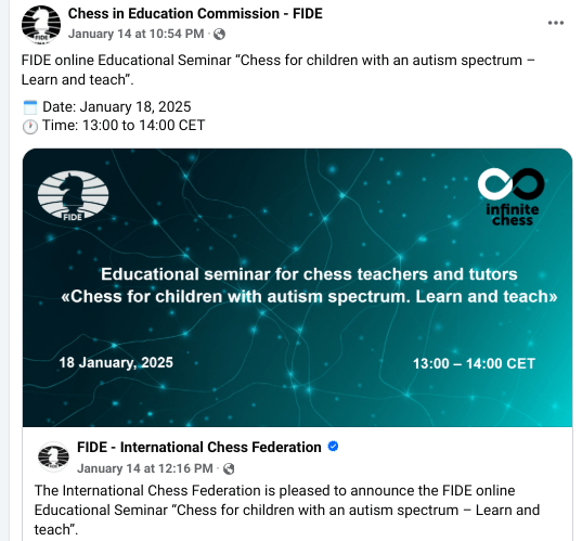 My final share has already happened and I missed it. A special talk about Chess and Autism. To find out more check out: https://infinitechess.fide.com/program/