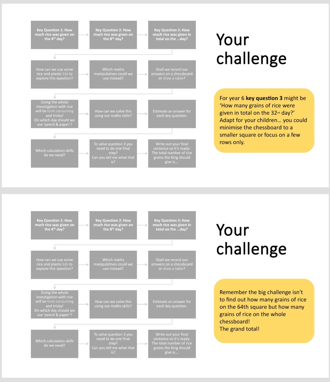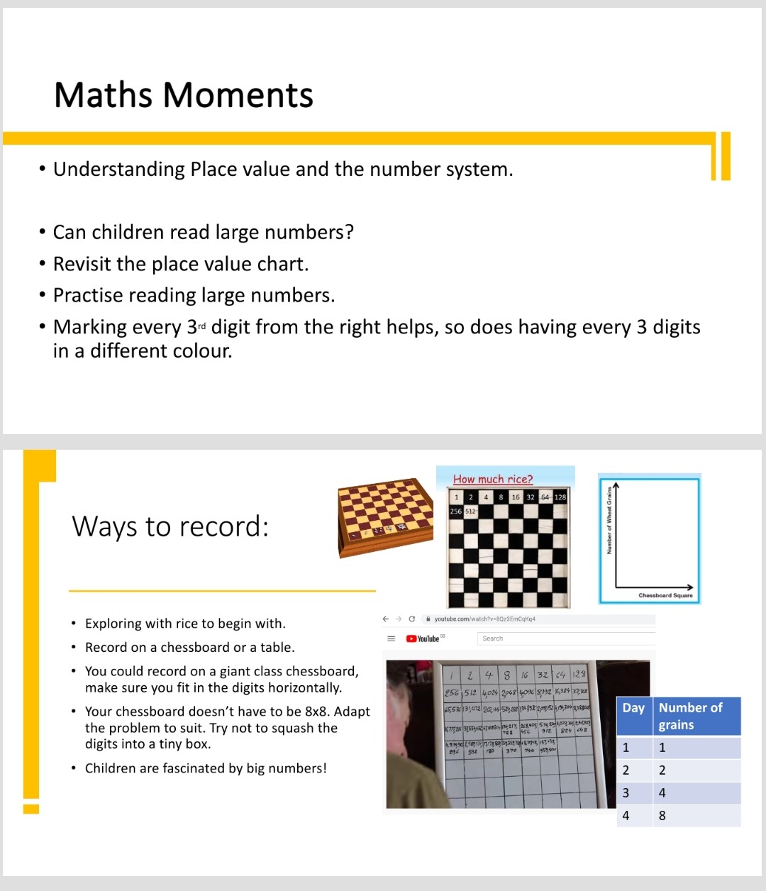 Not only does it show the beautiful game of chess but it also sets the scene for the classic grain of rice maths problem. With young children explore doubling or maybe focus on patterns, repeating patterns or growing patterns. You could if you preferred, explore ‘how many squares’ on a mini chessboard. Some schools have a whole school book with different tasks for each year group. At the end of the week everyone’s learning is shared.