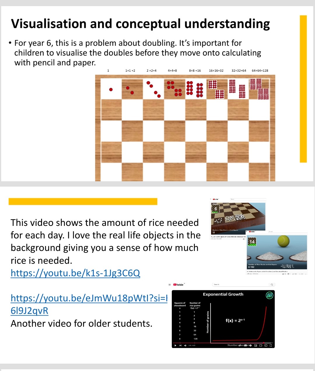 With older children you might explore doubles, exponential growth and powers.