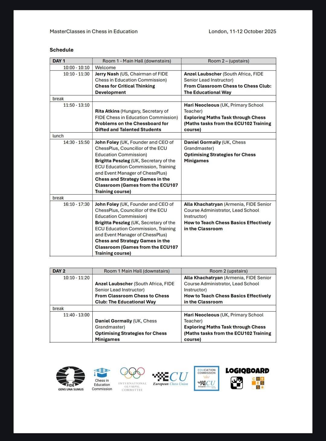 The Every Lesson Counts, Chess in Education Masterclasses were a huge success. An event organised by the FIDE Education Commission, the European Chess Union and Education Commission, ChessPlus, The Olympics Committee and our very own LogiqBoard.