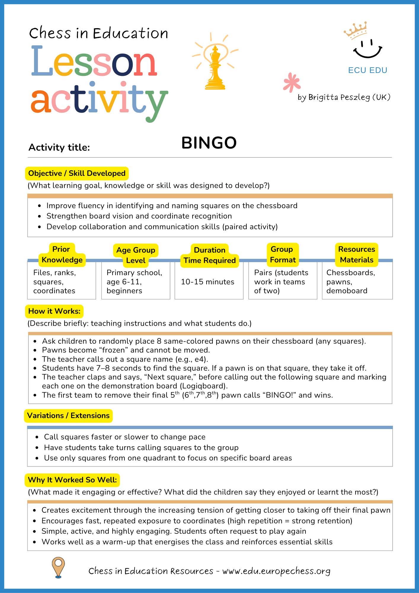 We also found time to record some reflections and play Chess Bingo. Thank you Brigitta for sharing the first lesson in the ECU initiative to build bank of great chess lessons. Please do click on the link and add one of yours. I’m deciding which lesson to share this week…