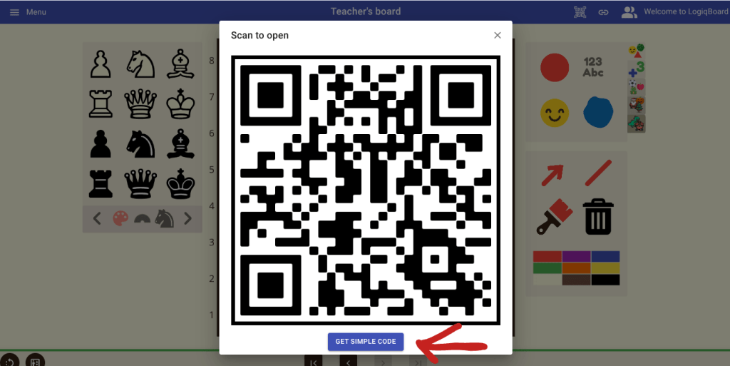 - The teacher displays the game/task and clicks on the QR code, top right.
